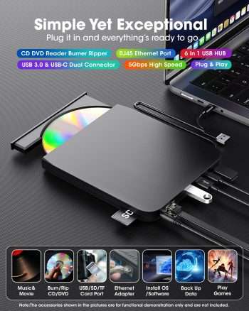 - 【Simple Plug & Play】No driver installation or complicated setup required! Just plug the USB 3.0 type-C data cable (neatly stored on the bottom) into your computer directly or a self-powered USB hub, and it will be recognized automatically (on Mac, a disc icon appears on the desktop once a disc is inserted). You can then use your preferred software to read, burn, or rip discs easily, just like using an internal optical drive. (Scroll down for detailed setup guide and recommended software.)
