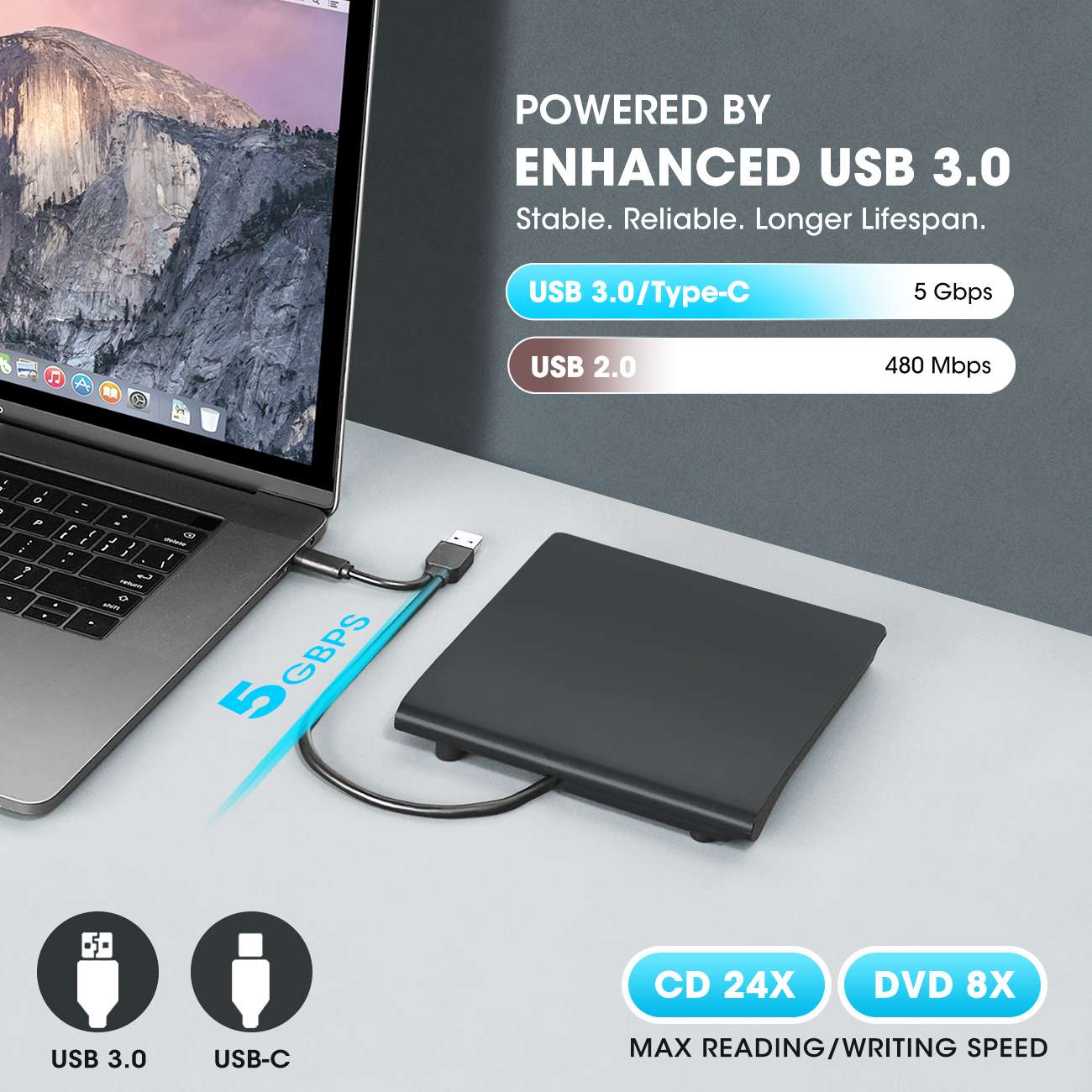• 【High Speed & Dual Connectors】Enhanced USB 3.0 technology not only delivers high-speed data transfer up to 5 Gbps (625MB/s) — 10× faster than USB 2.0 — with DVD 8X and CD 24X max read/write speeds, but also provides stable and reliable performance with strong error correction, noise reduction, smooth operation, and long-lasting durability. Its built-in dual connectors (Type-A & Type-C) make it versatile and easy to use with most laptops or desktops — no adapters or hubs needed!