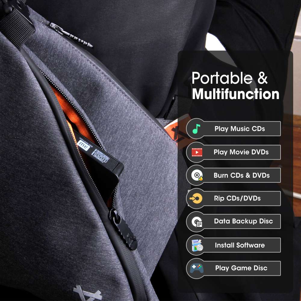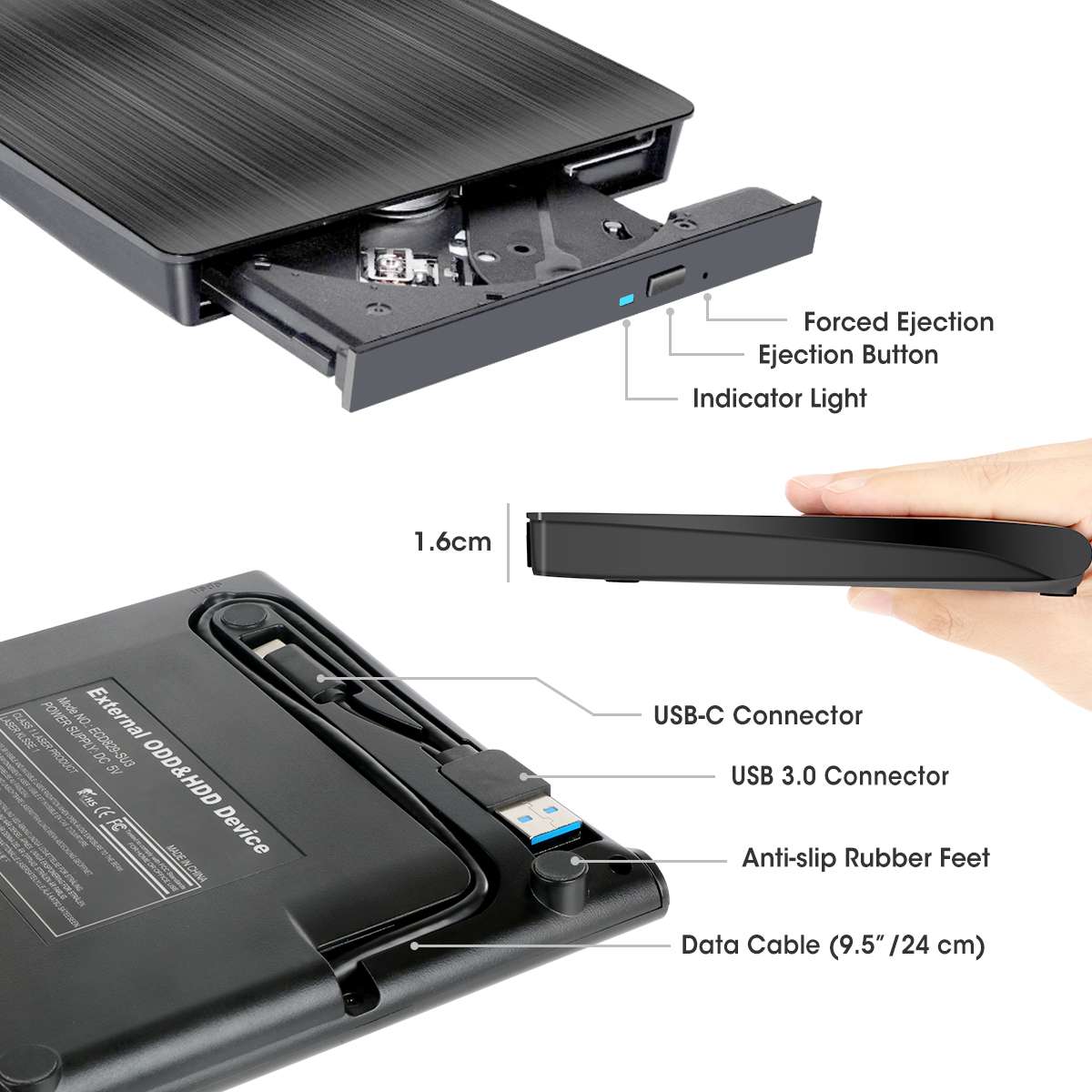 • 【Simple Plug & Play】No driver installation or complicated setup required! Just plug the USB 3.0 type-C data cable (neatly stored on the bottom) into your computer directly or a self-powered USB hub, and it will be recognized automatically (on Mac, a disc icon appears on the desktop once a disc is inserted). You can then use your preferred software to read, burn, or rip discs easily, just like using an internal optical drive. (Scroll down for detailed setup guide and recommended software.)