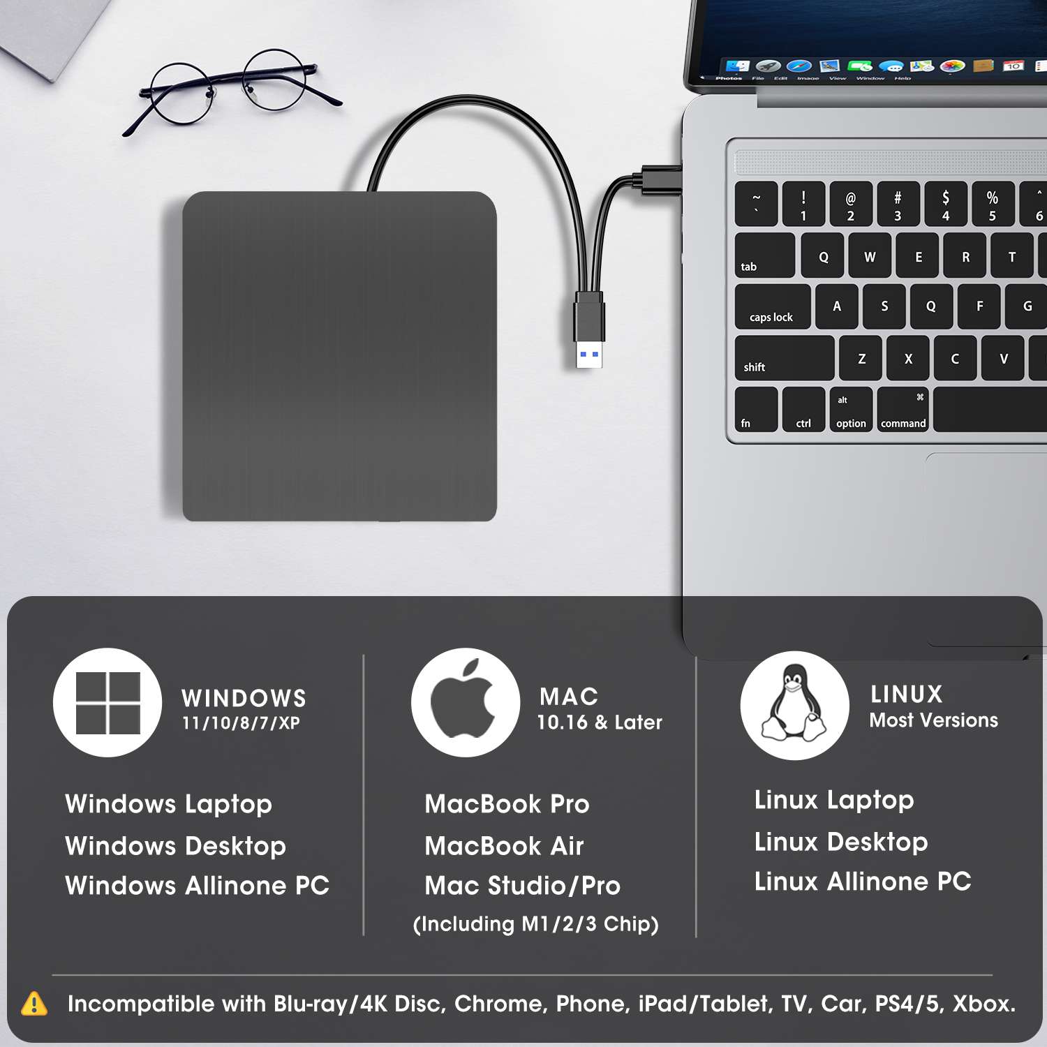 • 【Wide Compatibility】Works with Windows 11/ 10/ 8.1/ 7/ Vista/ XP, most Linux systems, and macOS 10.16 or later. Perfect for Apple MacBook, iMac, Mac mini/Studio, and most Windows laptops, desktops, or all-in-one PCs from brands like HP, Dell, Lenovo, ASUS, LG, Samsung, and Microsoft. For desktops, connect to a rear USB port for stable power. Not compatible with Chromebooks (ChromeOS), iPads/tablets, smartphones, TVs, projectors, vehicles, some Surface models, or Blu-ray/4K discs