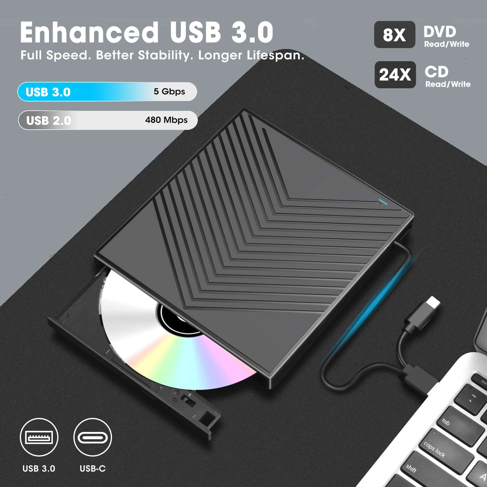 • 【High-Speed Data Cable & Separate Power Cord】The data cable under the optical disk drive features both USB-A and Type-C two kinds of connectors, allowing easy connection to laptops or desktops without an adapter or hub. USB 3.0 is an updated version of USB 2.0 that offers transfer speeds up to 5 Gbps (10 times faster than USB 2.0), and supports read/write speeds of 24x for CDs and 8x for DVDs, ensuring smooth performance. If the drive isn’t receiving enough power through the data cable alone, use the included power supply cord to draw additional power from a USB power adapter or power bank. (Note: The power cord is not a data cable and should not be used independently.)