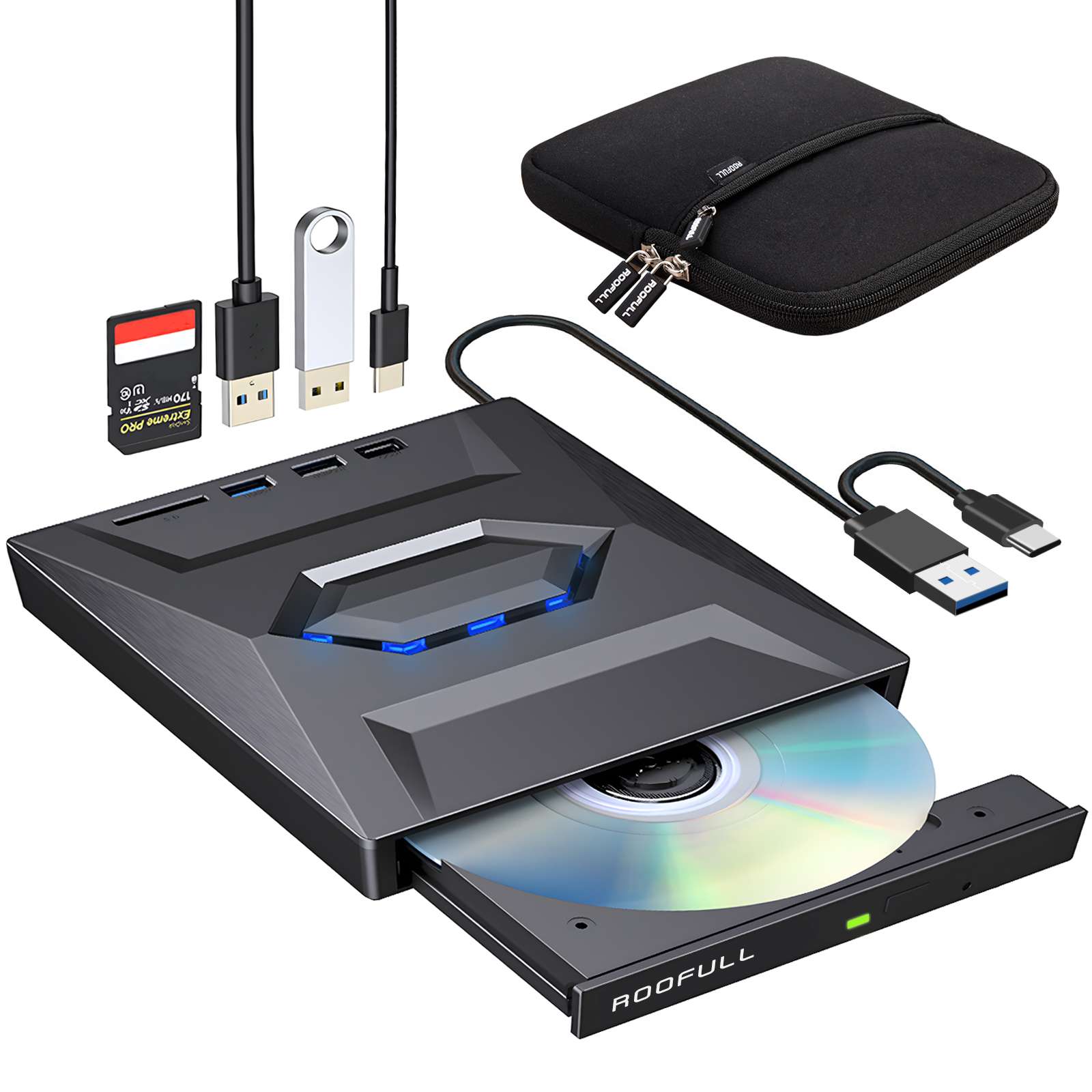 ROOFULL External CD DVD Drive USB 3.0 & USB-C CD ROM Burner DVD Player with USB Hub and SD Card Reader, Portable CD DVD +/-RW Optical Disk Drive Writer for Laptop PC Windows 11/10, Mac, Linux Computer