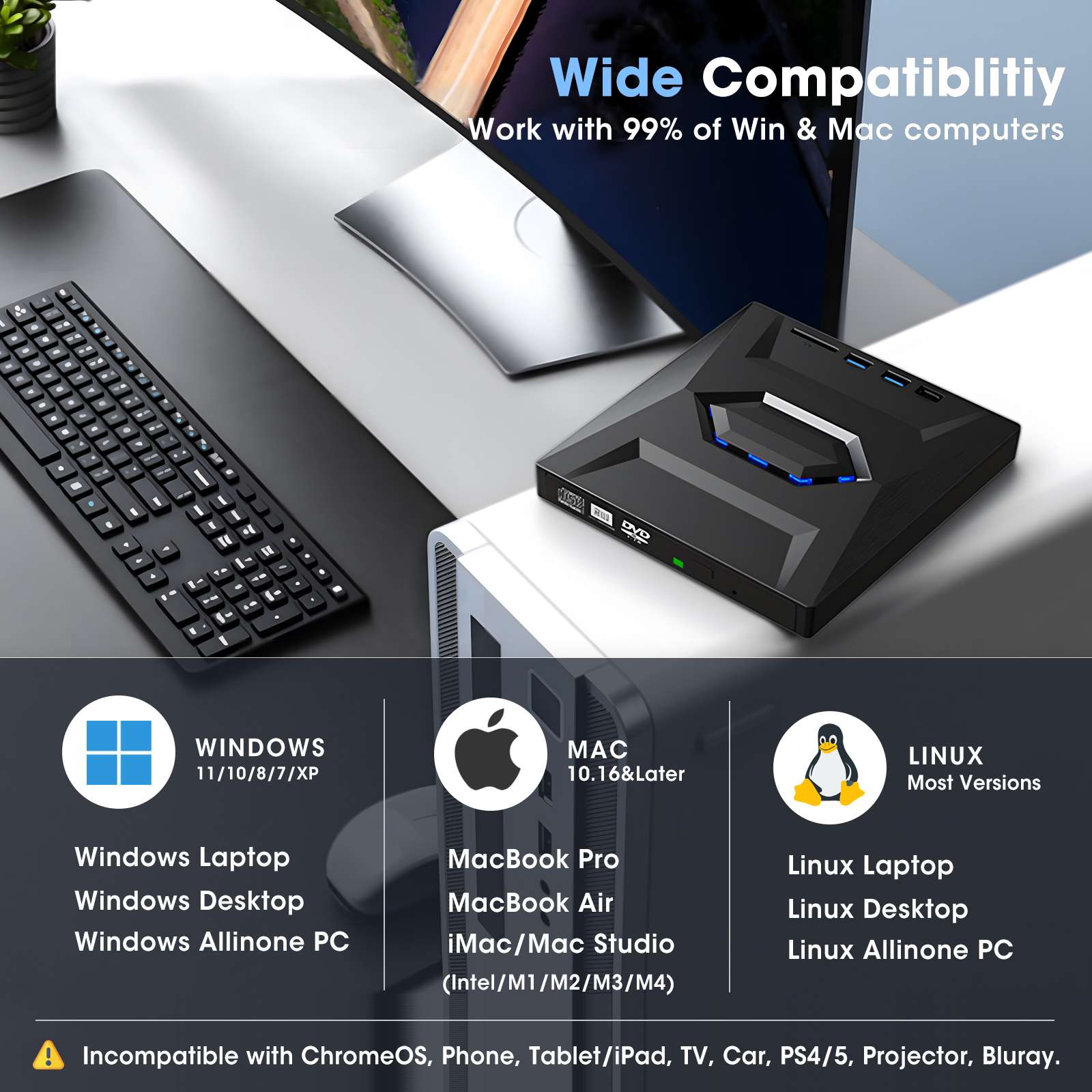 • 【Designed for Most Computers】This USB external DVD drive for PC is effortlessly compatible with Windows 11/ 10/ 8.1/ 7/ Vista/ XP/ 98/ SE/ ME/ 2000, Linux, and Mac OS X (media player and network required for Windows 11/12). It seamlessly complements a variety of laptops, notebooks, desktops, and all-in-one computers from renowned brands like HP, LG, SAMSUNG, ASUS, DELL, Lenovo, ThinkPad, Microsoft, Apple MacBook, and more. But please note that this drive is not compatible with Chromebooks, mobile phones, tablets, iPhones, iPads, cars, projectors, PS, or TVs
