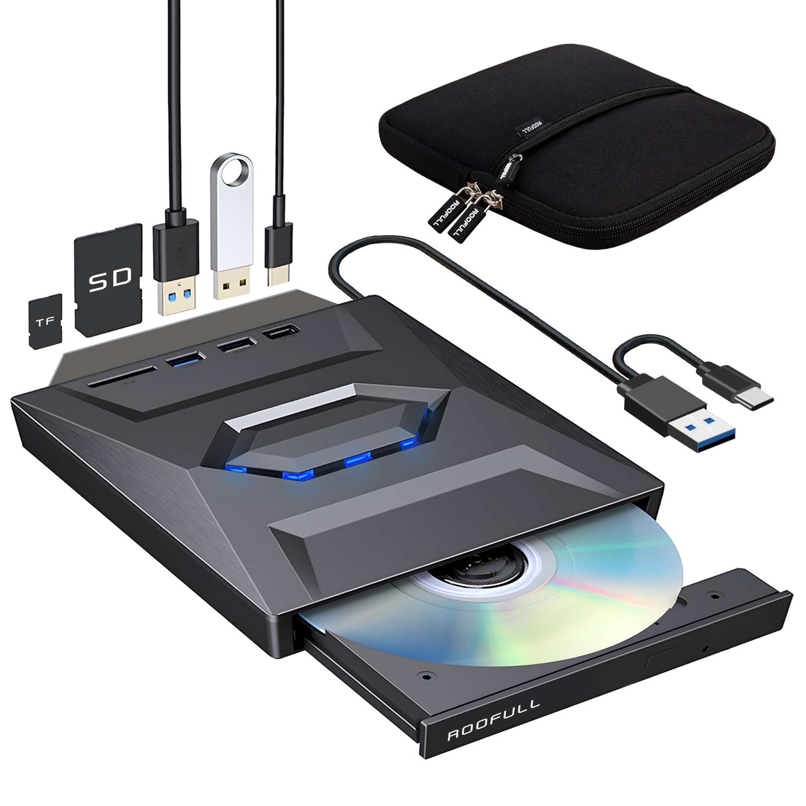 ROOFULL External CD DVD Drive with USB 3.0 Type-C Ports + SD Card Slot + Carrying Case for Laptop PC, CD DVD +/-RW Reader Writer Burner Player ROM Optical Disk Drive for Windows, Mac, Linux Computers