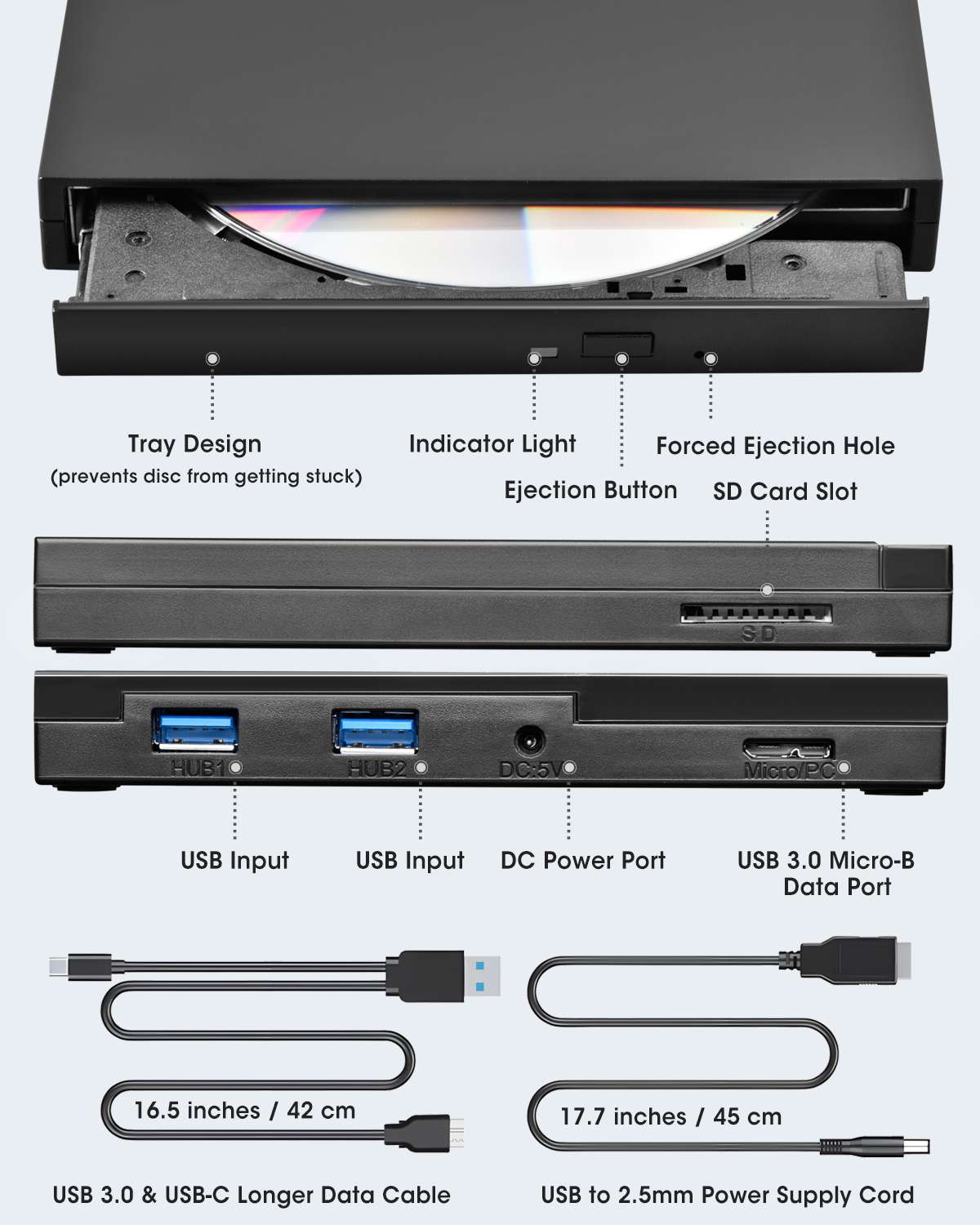 - 【Additional USB Hub】This drive can not only read, burn, and copy CD and DVD discs, but also be used as a USB hub, including 2x USB-A input ports and 1x SD/micro-SD card slot, compatible with the external hard drive, wired mouse or keyboard, flash drive, and other USB accessories, the SD/TF card reader is perfect for transferring photos and video files by your camera from cards to your computer. (Note: The USB flash drive, receiver, and SD cards in the picture are not included.)