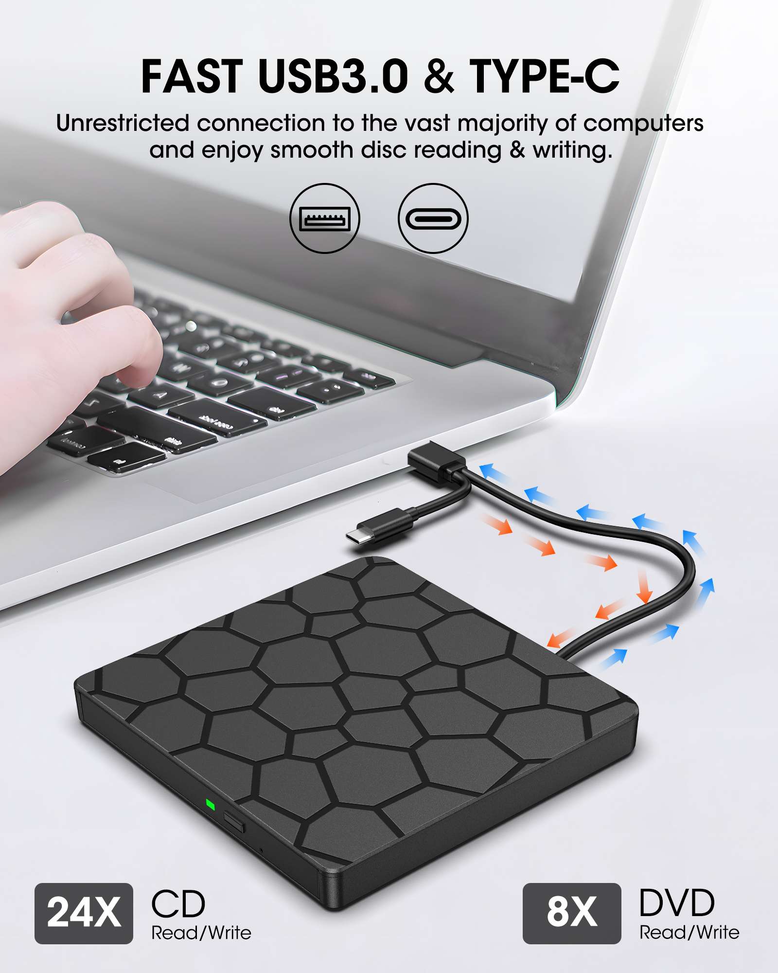 • 【Plug and Play】Powered by USB port, no additional drivers or power supply required! Just plug the USB type-A or type-C connector on the data cable into your computer, and this DVD drive will be detected by your computer automatically (On Mac, the disc drive icon will appear on the desktop after a disc is inserted and successfully read). You can then use the corresponding software to read and write the discs with no complex settings!