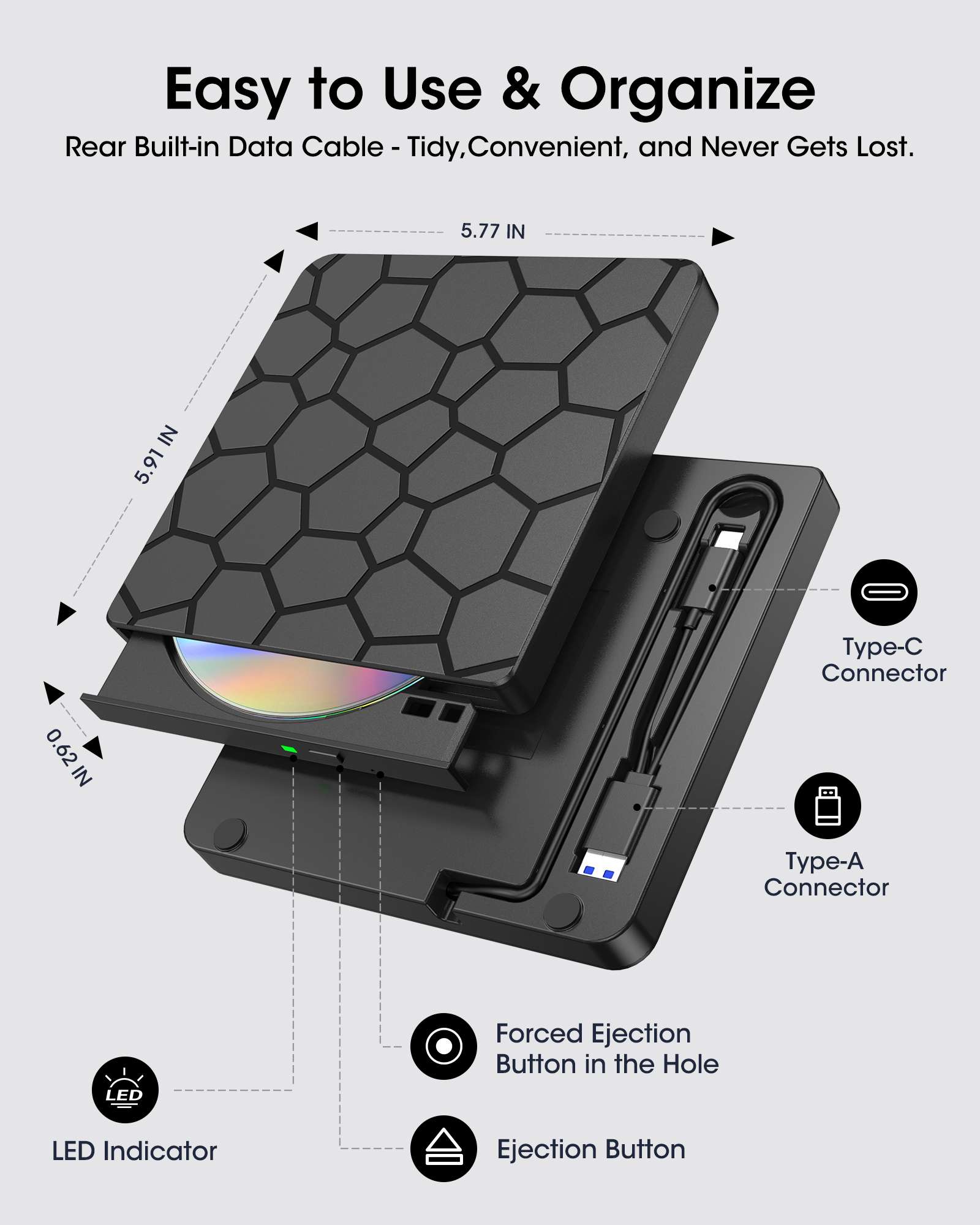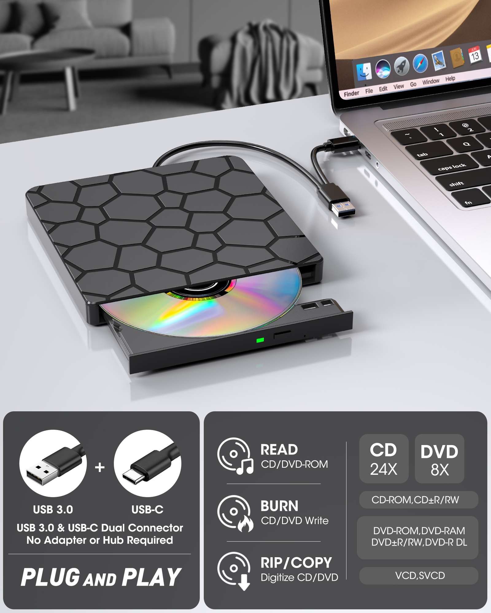 • 【Other Things to Know Before Purchasing】① To eject on macOS, right-click the disc icon on the desktop or go to File > Eject in Finder. The eject button may not open the tray after playing or burning a disc. ② “Plug and play” means no driver installation is needed, but software is still required for playback or burning. ③ The USB 3.0/Type‑C data cable (stored under the drive) handles both data and power—simply plug it into your computer