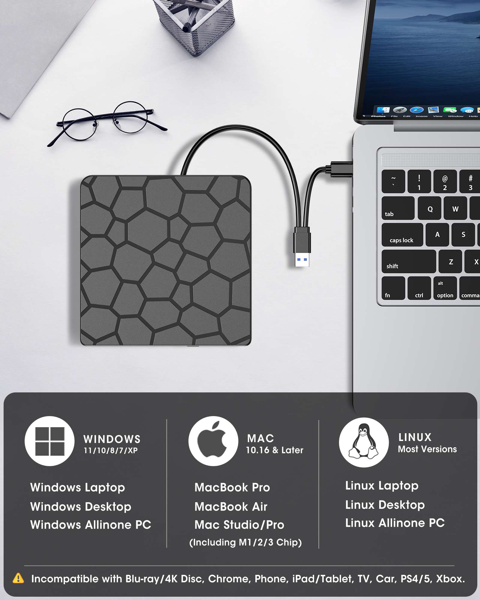 • 【Wide Compatibility】Works with most laptops, desktops, and all-in-one PCs running Windows 11/10/8/7/Vista/XP or Linux, as well as macOS 10.16 and later (including MacBook Air, MacBook Pro, iMac, and Mac Studio). For desktop towers, connect to a rear USB port for stable power. Not compatible with Chromebooks, iPads, iPhones, tablets, projectors, TVs, cars, trucks, Surface (some models), PS4/5, Xbox, Switch, or Blu-ray/4K discs