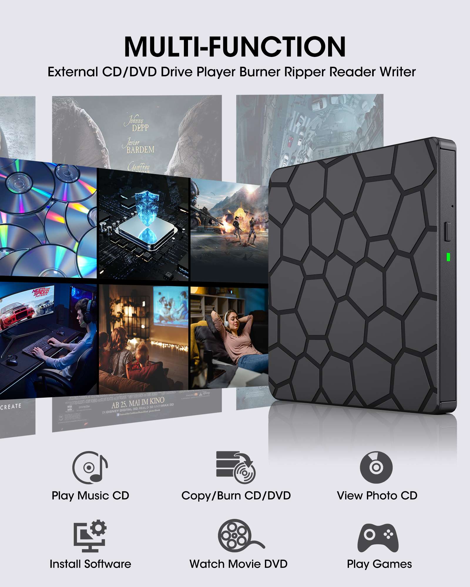 • 【External CD/DVD Drive for Laptop】 If you’re looking for a simple and durable external CD/DVD drive with no complicated design or extra ports, the ROOFULL RF868 is made for you, offering effortless use and smooth, stable performance. Instantly play movie DVDs, burn music or video discs, convert CDs/DVDs into digital files, view photos, read medical CDs, install software from discs, back up data for long-term storage, and more—just as easily as an internal optical drive!