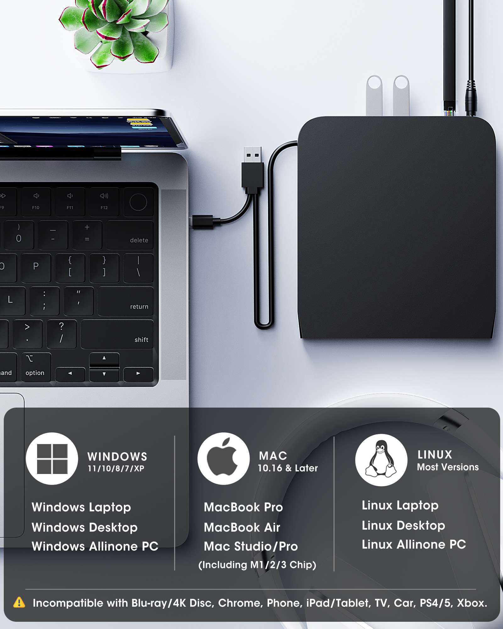 - 【Highly Compatible CD/DVD Drive】This CD/DVD-ROM+/-RW drive supports CD±R/RW, CD-ROM, DVD±R/RW, DVD-ROM, DVD-RAM, VCD, and SVCD. It works with most laptops, desktops, and all-in-one computers running Windows 11/10/8/7/Vista/XP or Linux, as well as Apple MacBook Pro, MacBook Air, iMac, and Mac Studio/Mini running macOS 10.16 or later. (Note: Chromebooks, smartphones, TVs, iPads, tablets, projectors, cars, PS3/4/5, Xbox consoles, and Blu-ray/4K discs are not supported.)