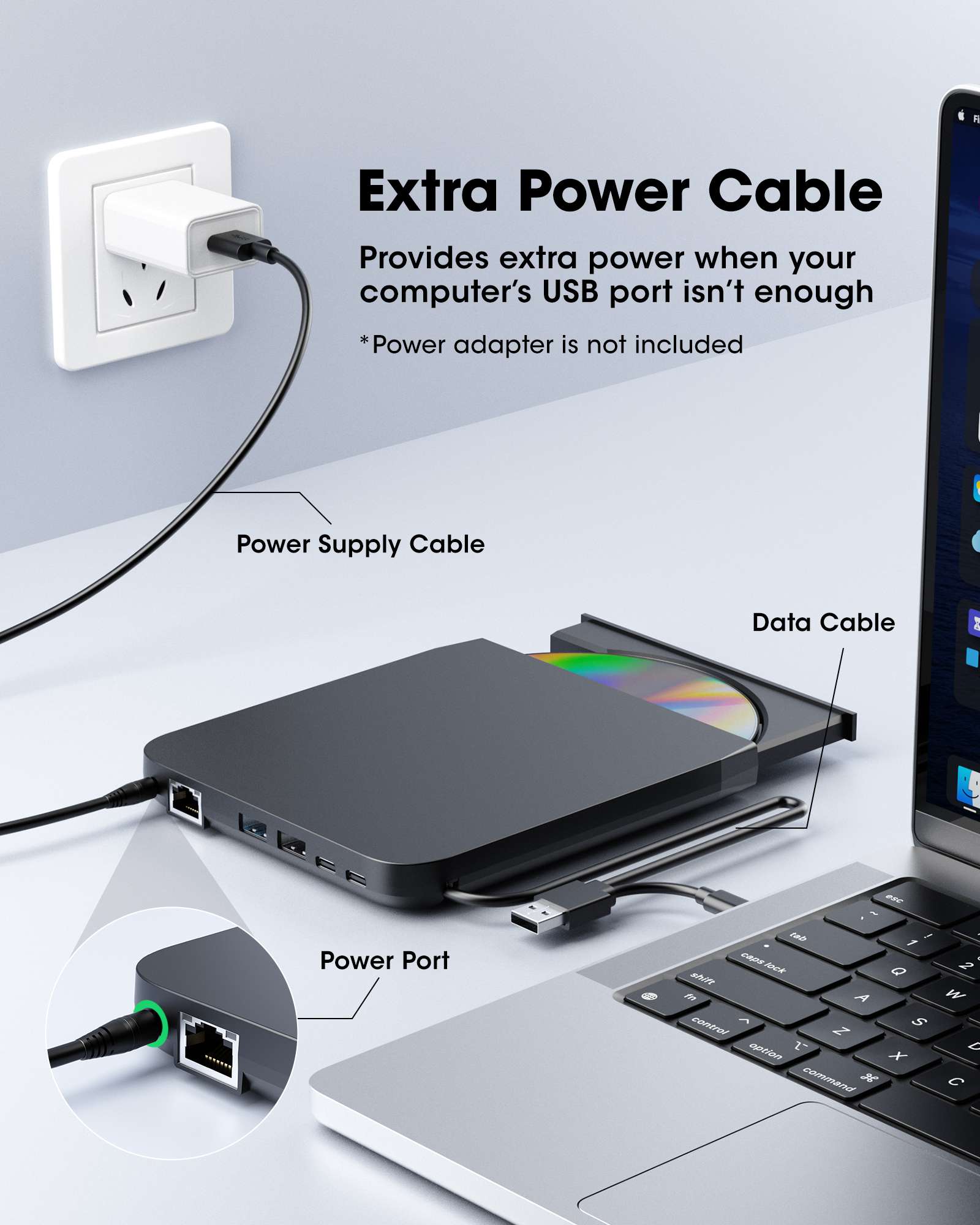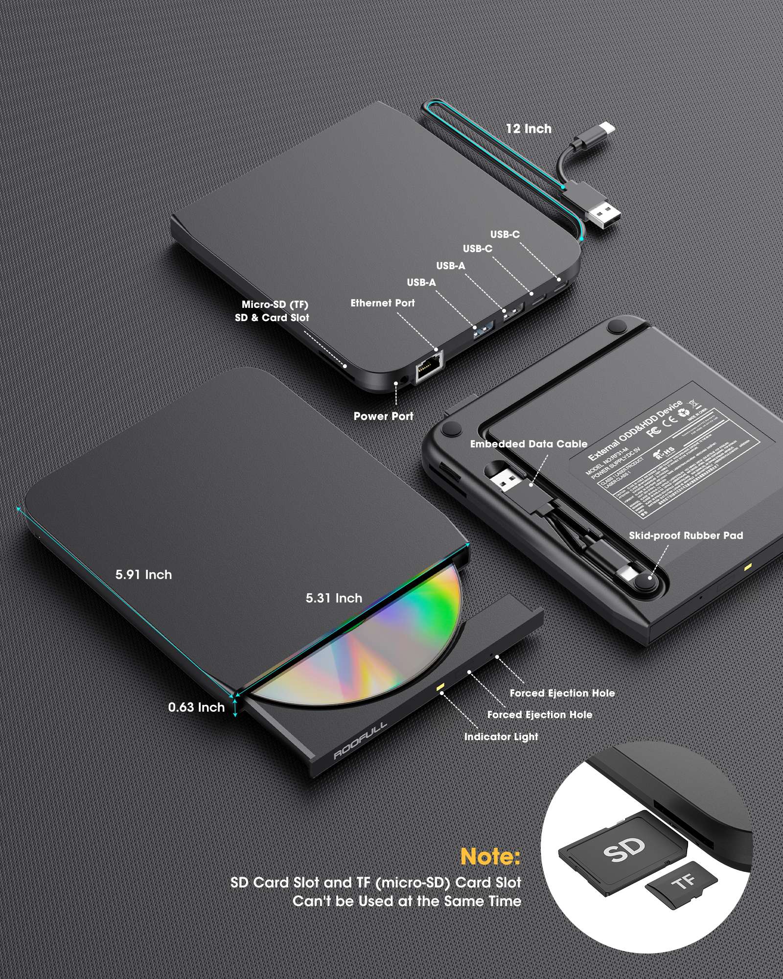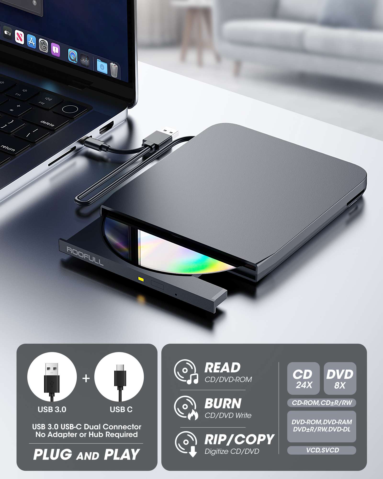 - 【What You Get】ROOFULL Pro External CD/DVD Drive *1, USB-A to DC Power Supply Cable*1, User Manual*1