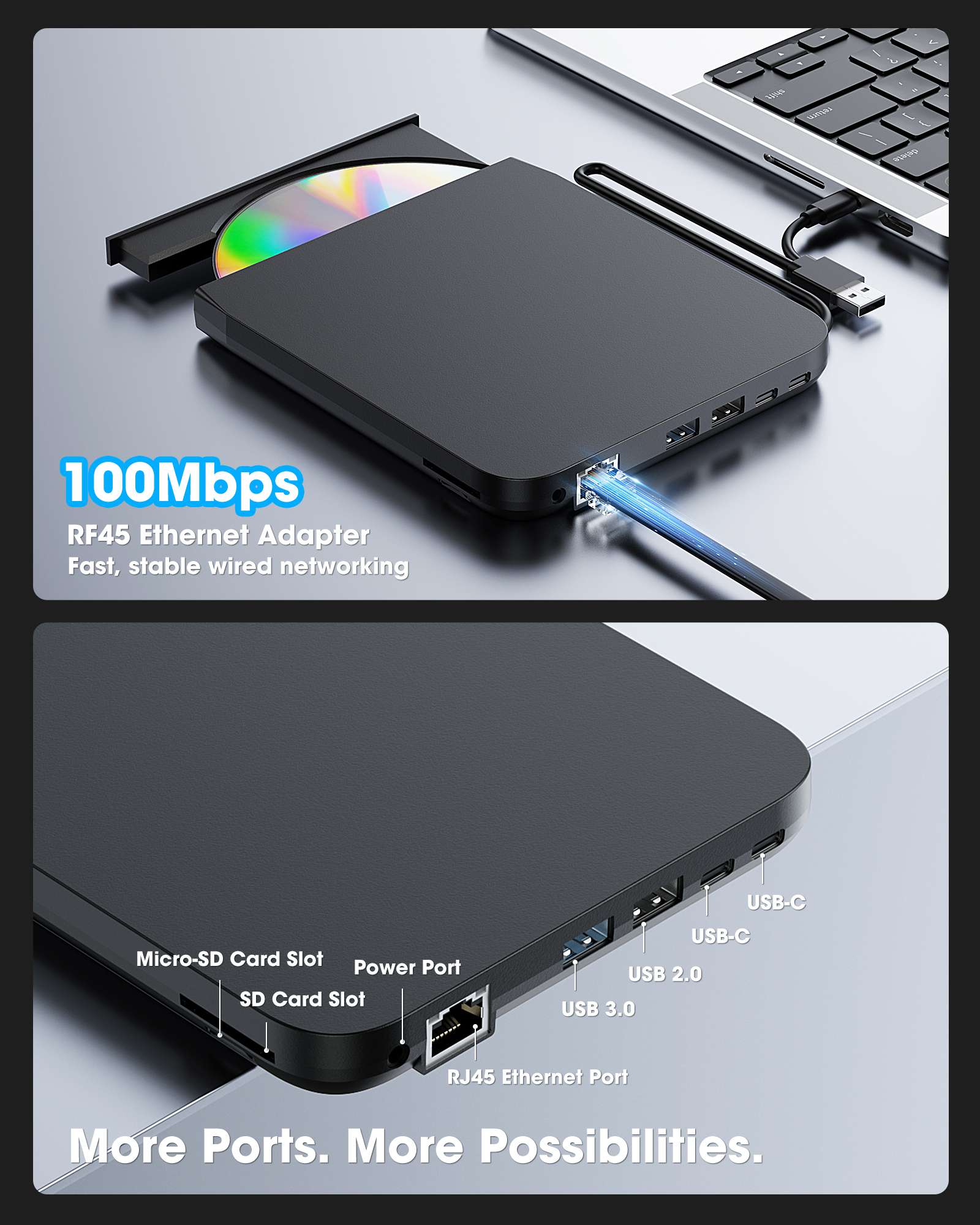 - 【9-in-1 Full-Featured Network & CD/DVD Adapter】It’s not only a CD/DVD reader, player, writer, rewriter, burner, recorder, and ripper, but also a USB 3.0 computer network adapter, a 2×USB-A and 2×USB-C hub, and an SD & TF card reader. With this DVD adapter, you can not only play music CDs and movie DVDs, burn audio or video to blank discs, import (rip) audio CDs or video DVDs into digital files, view photo discs, install software or operating systems, play games, and back up data, but also connect to Ethernet LAN (up to 100Mbps) and hook up external hard drives, USB flash drives, mice, keyboards, or other peripherals