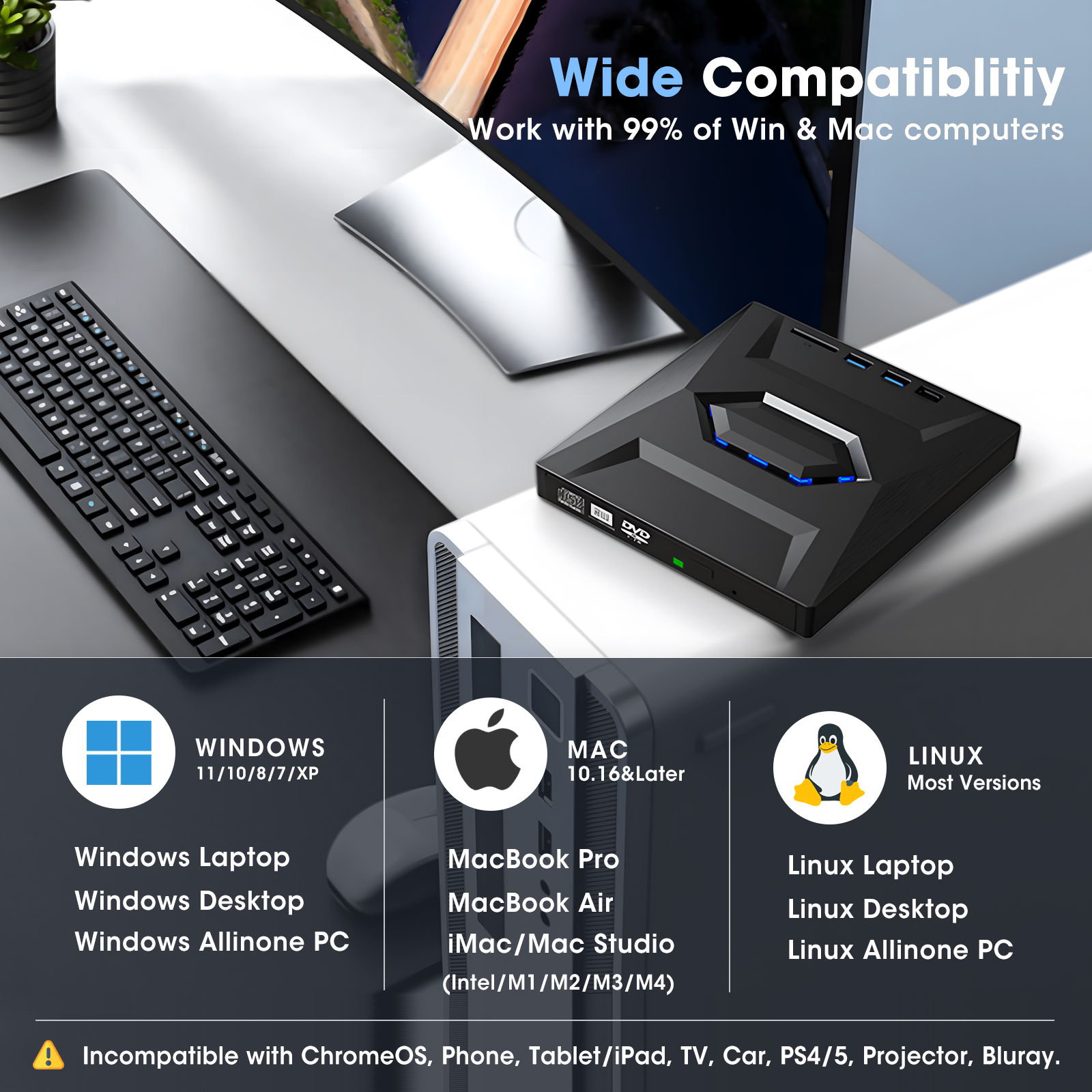 - 【Wide Compatibility】This USB external DVD drive for PC is effortlessly compatible with Windows 11/ 10/ 8.1/ 7/ Vista/ XP/ 98/ SE/ ME/ 2000, Linux, and Mac OS X (media player and network required for Windows 11/12). It seamlessly complements a variety of laptops, notebooks, desktops, and all-in-one computers from renowned brands like HP, LG, SAMSUNG, ASUS, DELL, Lenovo, ThinkPad, Microsoft, Apple MacBook, and more. NOTE: It is not compatible with Chromebooks, mobile phones, iPhones, iPads, cars, projectors, or TVs
