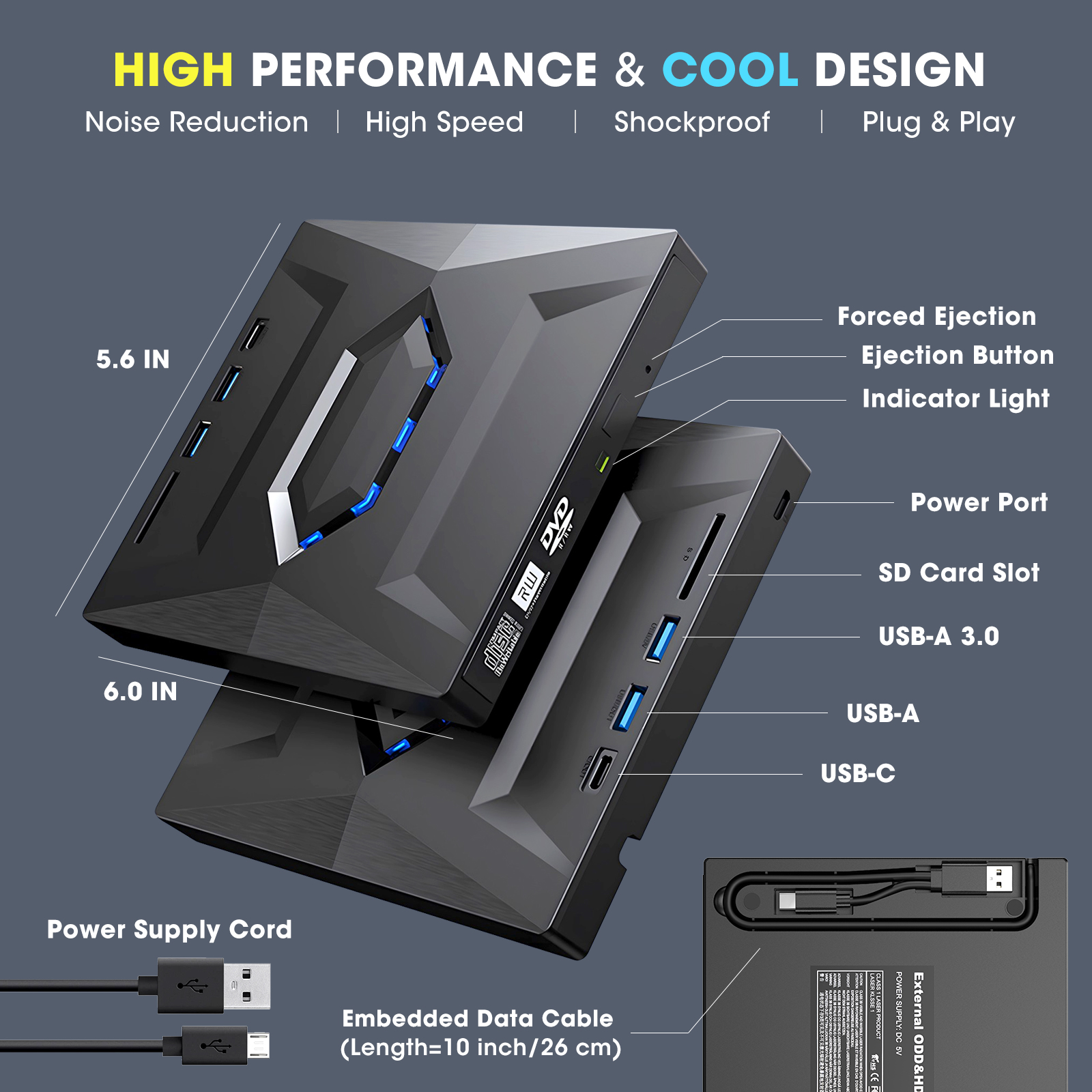 - 【Integrated Multi-USB Hub】This external disk drive also serves as a multi-hub featuring 1* USB 3.0 port, 1* USB 2.0 port, 1* USB Type-C port, and 1* SD card slot, so that you can effortlessly connect additional computer external components like a USB hard drive, wired mouse, keyboard, or flash drive, facilitating the seamless transfer of camera photos and videos from the card to your PC. Simplify your desktop setup with just one drive. (Note: Accessories shown in the picture are for functional display purposes only and are not included.)